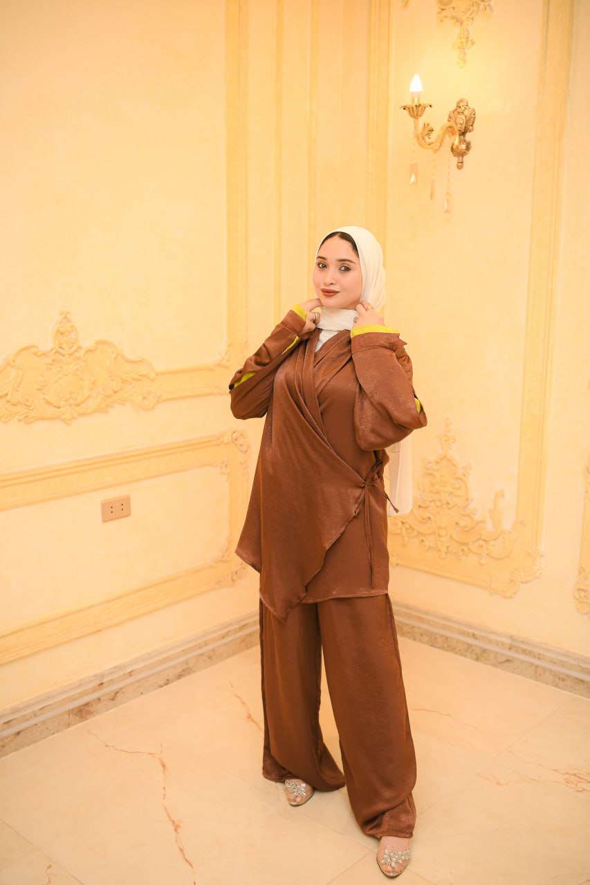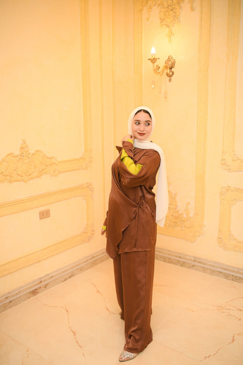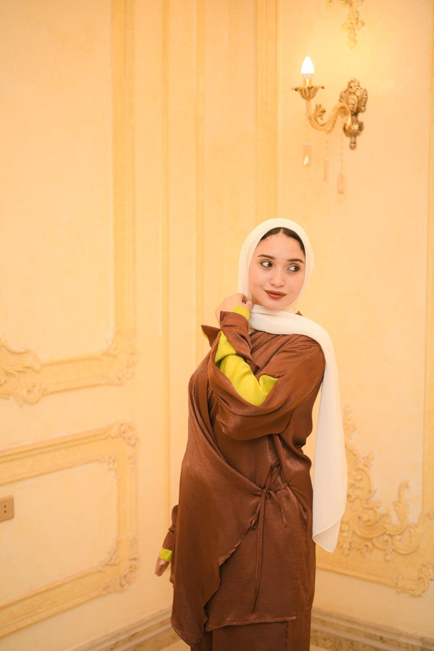 Make a bold statement with our Flowy Shimmer Set in rich brown with lime contrast cuffs. Lightweight, modest, and made to stand out.